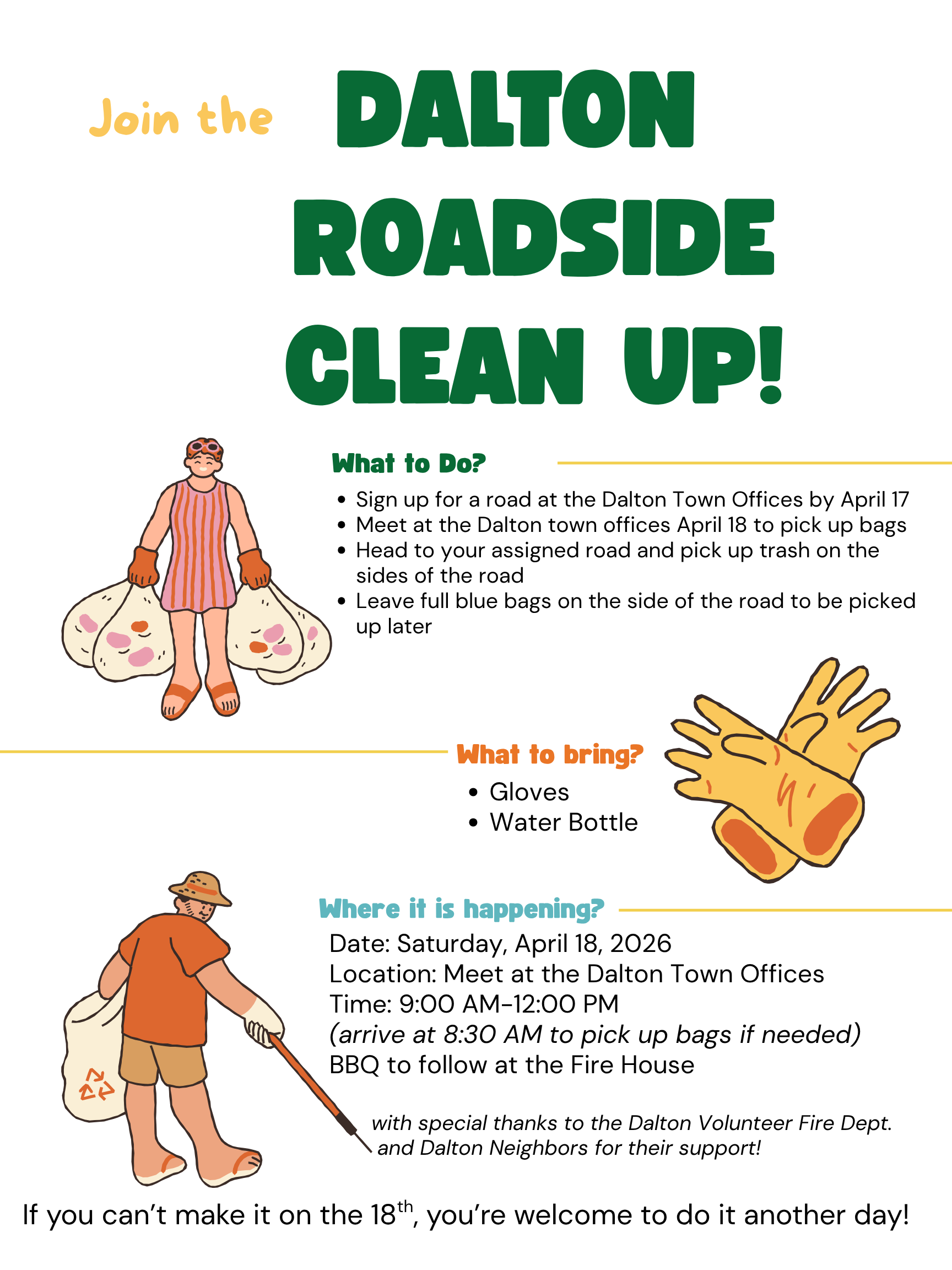 Help cleanup Dalton to keep us beautiful! Fill your belly with a BBQ at the fire station at noon! If you can’t help on this day, feel free to help on a day during the week leading up to our event.